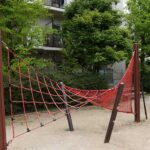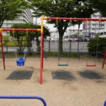 西宮市前浜町にある前浜南公園は、小型ザイルクライミングやバケット型ブランコがあり幼児にも安心
