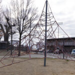 鉄棒が2組あり、でっかいあみあみの遊具と幼児用のユラユラ乗る遊具が2つのみです。
